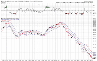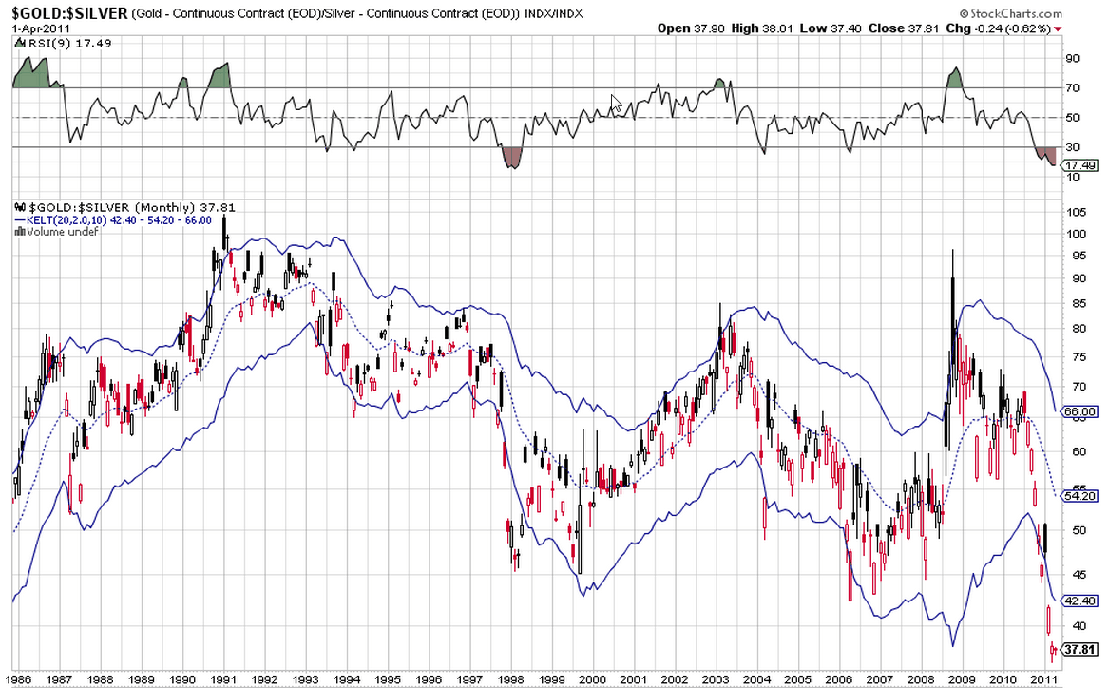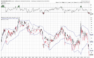 I've noticed when prices or ratios get out of the average range (the blue band that the ratio usually stays within) as they are now, what typically happens is a "correction to the mean", ie the ratio comes back within the band. Another thing I've noticed is when prices or ratios come way out of range they tend to correct to the mean by going outside the band in the opposite direction. Notice the black bar going way out of the top of the band in the latter part of 2008? That was the financial panic and market crash of 2008 when folks were loading up on gold way more than they were buying silver. We seem to be correcting that "imbalance" of the mean by going outside the band on the other side.
