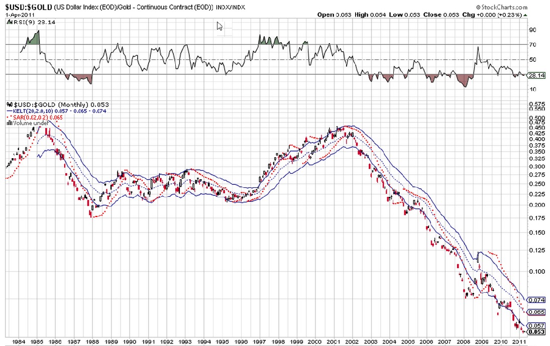 Here's a picture of the ratio of dollars to gold, or in other words, the decline of the purchasing power of the dollar. Since about the time of the market crash of 2000 (tech wreck), the US gov began debasing dollar value by printing more of them, in an attempt to keep up with the existing and new debt necessary for continuing gov operations.